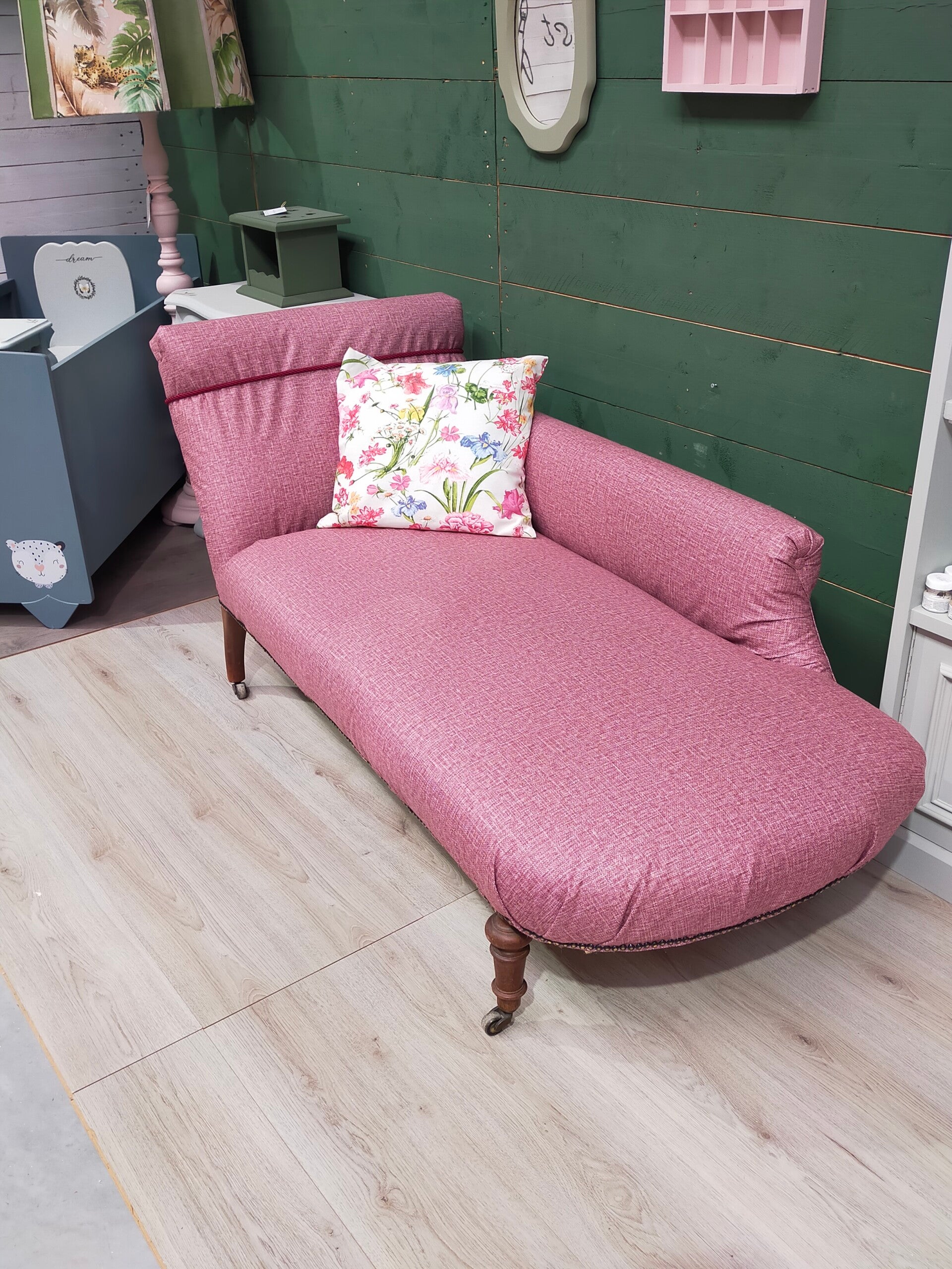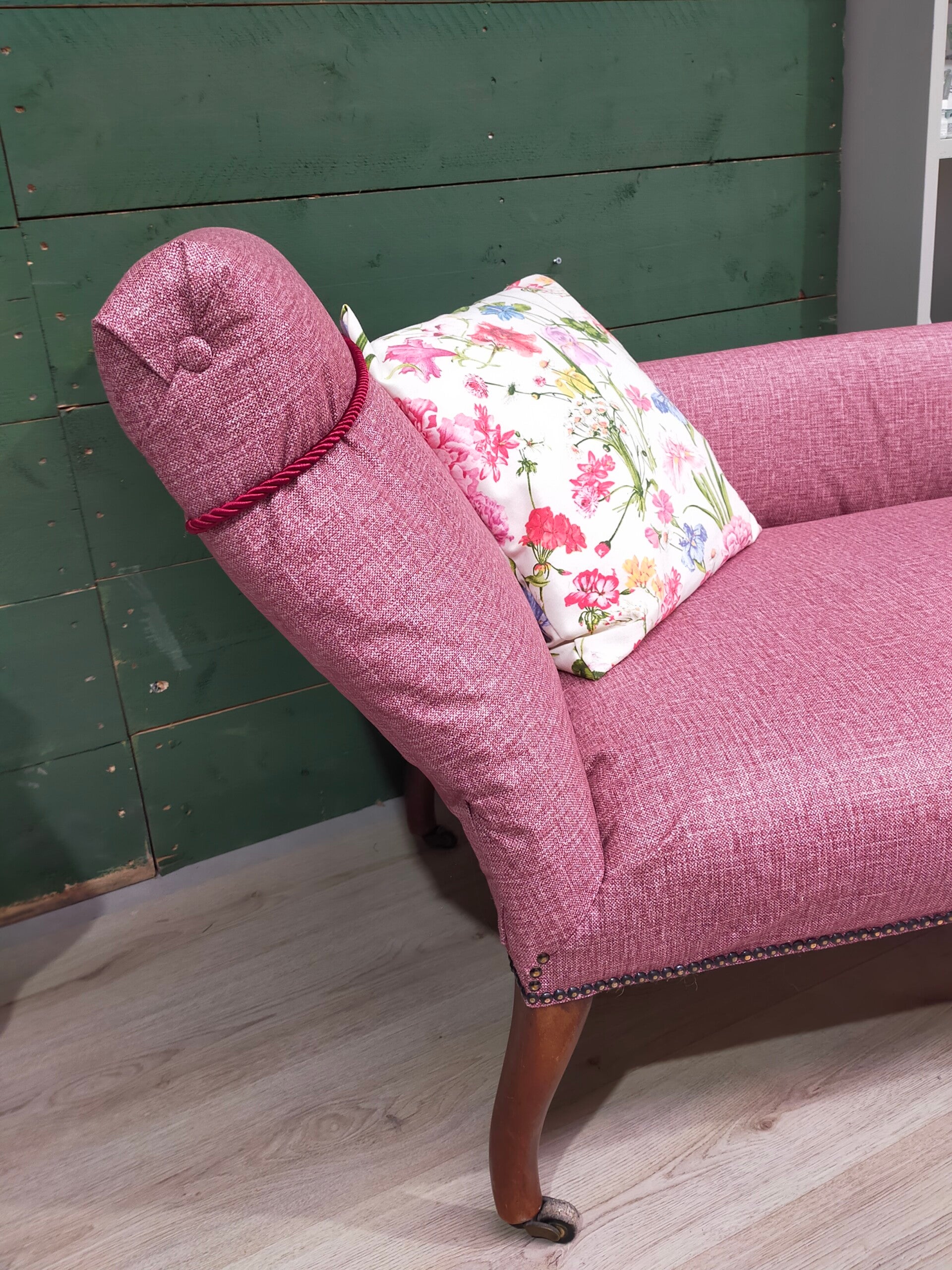 Prachtig lounge bankje, geheel opnieuw bekleed en voorzien van nieuw vulling/kussens. Het bankje is verstevigd en bekleed met rode meubelstof. Incl. bijpassend sierkussen. Onderaan de pootjes zitten kleine wieltjes.